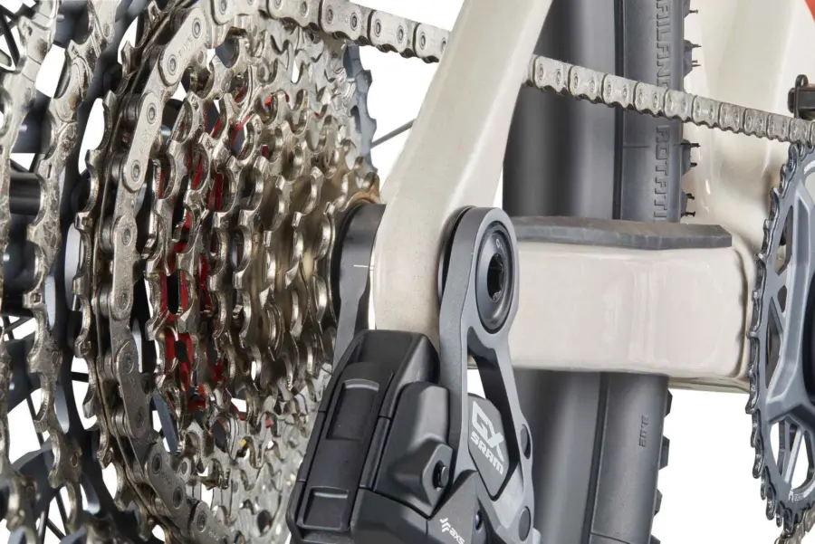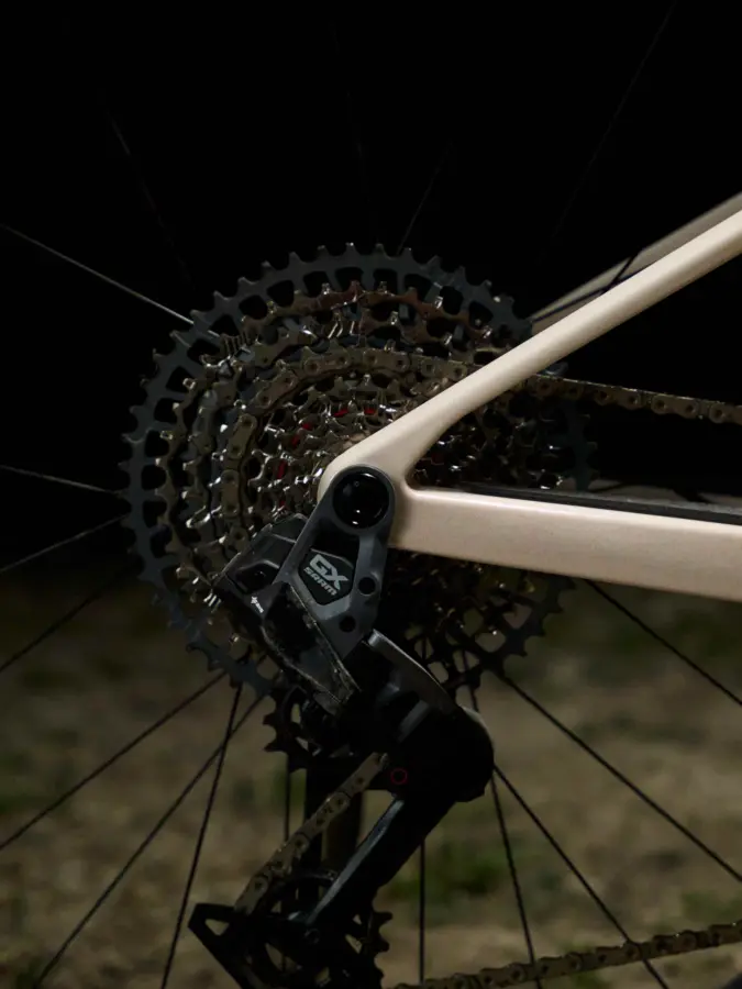 Le Twostroke 01 est compatible avec les transmissions AXS, Di2 et mécaniques et conçu autour d’une ligne de chaîne de 55mm et compatible avec plateaux de 26 à 38 dents.