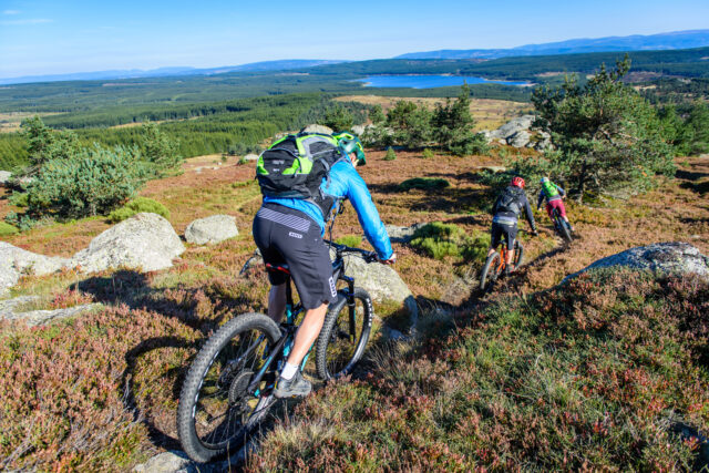 Le trail offre une multitude de visages : parfois très roulants, parfois très techniques. Le changement est permanent. Parfois c’est la grande surprise. Après un passage bien rapide, le sentier change brusquement de versant dans un virage en aveugle. Juste derrière c’est un champ de bataille : racines, dalles acérées, rochers effilés. C’est dans ces moments-là que l’on voit si nous avons encore nos réflexes : il faut attraper les freins tout en cherchant la bonne trajectoire. Après une dernière traversée technique ponctuée de parties montantes et descendantes, on gagne une piste forestière. De l’autre côté, une bonne montée nous attend. On voit le sentier grimper très haut jusqu’à une crête. Ulysse qui est en VTTAE part devant et m’attend au sommet de la crête. Derrière, j’essaie de faire un maximum sur le vélo, mais la pente est vraiment raide. Je pousse sur les quelques derniers mètres. Nous profitons du lieu et de la vue pour faire une bonne pause. La végétation a déjà pris sa couleur d’automne, les arbres, les alpages, tout se pare de roux. Nous poursuivons notre descente, à la limite de la forêt. Le sentier continue de traverser ce flanc de montagne. Nous avons depuis le début de notre parcours la montagne à gauche, le vide à droite. Mis à part quelques lacets qui nous font changer de sens, nous évoluons toujours dans la même direction. Plus bas, alors que nous nous enfonçons dans la forêt et que le soleil décline, nous croisons un couple de chevreuils. Peu farouches, ils se laissent observer quelques minutes. Quel magnifique spectacle que d’admirer ces animaux dans leur milieu naturel. C’est aussi pour ça qu’on fait du VTT, pour être au cœur de la nature et profiter de ces instants magiques.