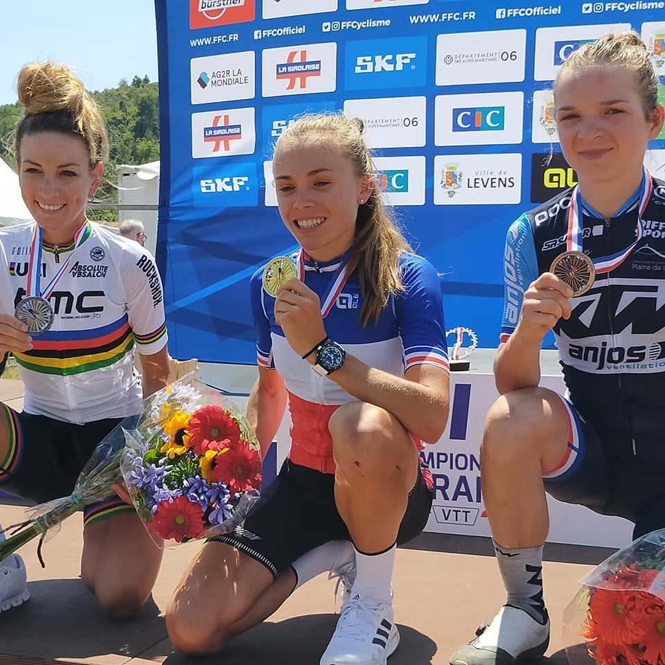 en XCO Elites, c’est, logiquement Loana Lecomte, toujours aussi affamée, qui s’est emparée du titre (et également en espoir dames), devant Pauline Ferrand Prévot et Léna Gérault, également très en forme. A noter la 6ème place de Julie Bresset dont c’était le dernier rendez-vous depuis qu’elle annoncé mettre un terme à sa carrière en VTT.