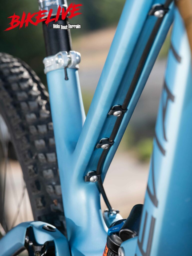 En dernier lieu, la géométrie est assez classique pour un pur vélo de trail moderne. Deviate n’a pas succombé à l’extrêmement long, bas et ouvert. Un choix judicieux pour ce type de vélo qui se veut passe-partout. Nous attirons juste votre attention sur l’angle de selle de 76° mais totalement dans l’axe du boîtier de pédalier du fait que la roue recule sur l’ensemble du débattement. Nous verrons que cette spécificité est à prendre en compte pour le choix de la taille du cadre.