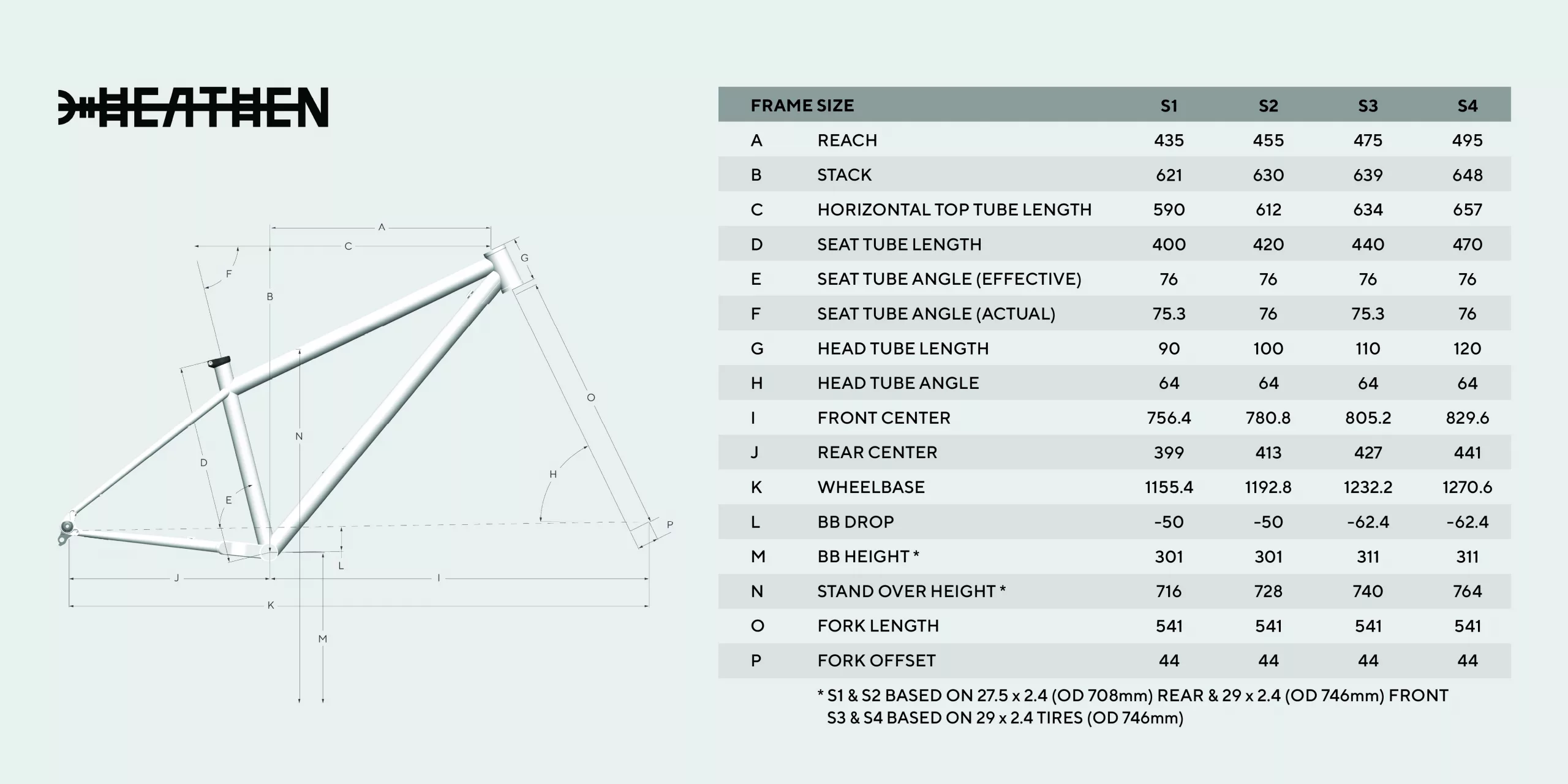Le Heathen, c’est un semi-rigide qui est proposé avec le système Oneride de la marque, qui permet de choisir différents tailles de cadres adaptées de façon proportionnelle, à chaque morphologie. Il est prévu pour recevoir une fourche de 130 mm. Les tailles S1 et S2 sont montées en mulet (27.5 à l’arrière et 29 pouces devant) tandis que les S3 et S4 sont en 29 pouces avant et arrière. Ce choix permet de maintenir le ratio avant-centre et arrière-centre de façon à préserver les caractéristiques et la géométrie quelle que soit la taille.