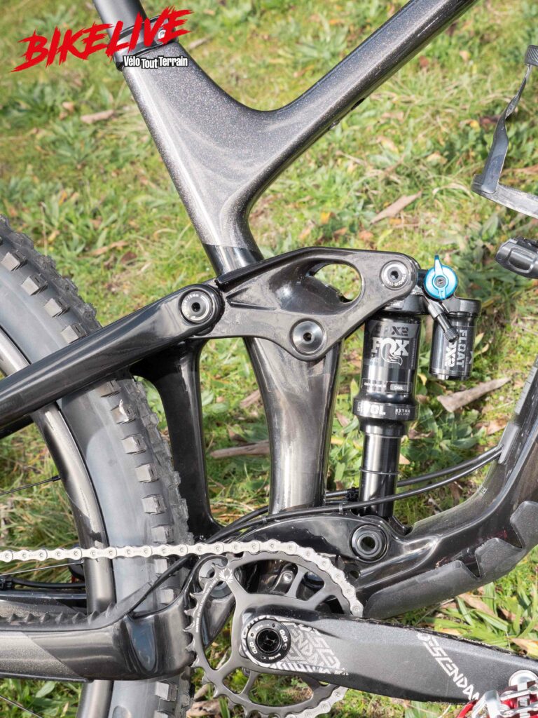 Le vélo est étonnant dans les parties cassantes où il gomme littéralement toutes les aspérités du terrain. Nous nous lançons rapidement à l’assaut de parties bien défoncées pour essayer de trouver les limites de cette machine, mais nous devons avouer que nous rendons les armes avant lui. Nous avons pu franchir des obstacles que nous pensions presque inenvisageables sans même toucher le levier de contrôle de la plateforme. Le Trance X est clairement un vélo qui aime avaler les difficultés et l’effet de chaîne est parfaitement adapté avec une tension soutenable, quel que soit son niveau de puissance appliqué sur les pédales. Nous sommes agréablement surpris de rarement toucher les pédales du fait de la hauteur de boîter en positon haute et de la grande stabilité de la suspension dans la zone de précontrainte. La réussite est d’autant plus importante que souvent les vélos ayant ce type de comportement (confortable) avec un maximum de motricité demandent beaucoup d’énergie. Il n’en est rien avec ce nouveau Trance X : son dynamisme correct permet de ne pas s’épuiser. Le plateau de 30 dents est sûrement une des clés de cette sensation sur des circuits longs avec du dénivelé. L’agencement de la suspension arrière est aussi en grande partie responsable de ce comportement. Nous avons un point de pivot virtuel qui se situe énormément en avant en début de course, ce qui permet de juguler la suspension quand nous sommes en position couchée sur l’avant et qui ensuite se déplace en direction de l’arrière pour avoir un maximum de contrôle en descente. Sur les parties plus plates, le Trance X est un rouleur honorable, ou du moins il ne demande pas une énergie folle pour prendre et garder la vitesse. Les roues carbone sont à leur avantage dans cet exercice. Les vététistes désirant un dynamisme accru pourront aussi se positionner en mode intermédiaire ou ferme de l’amortisseur Fox, qui dispose de trois positions de compression lente.