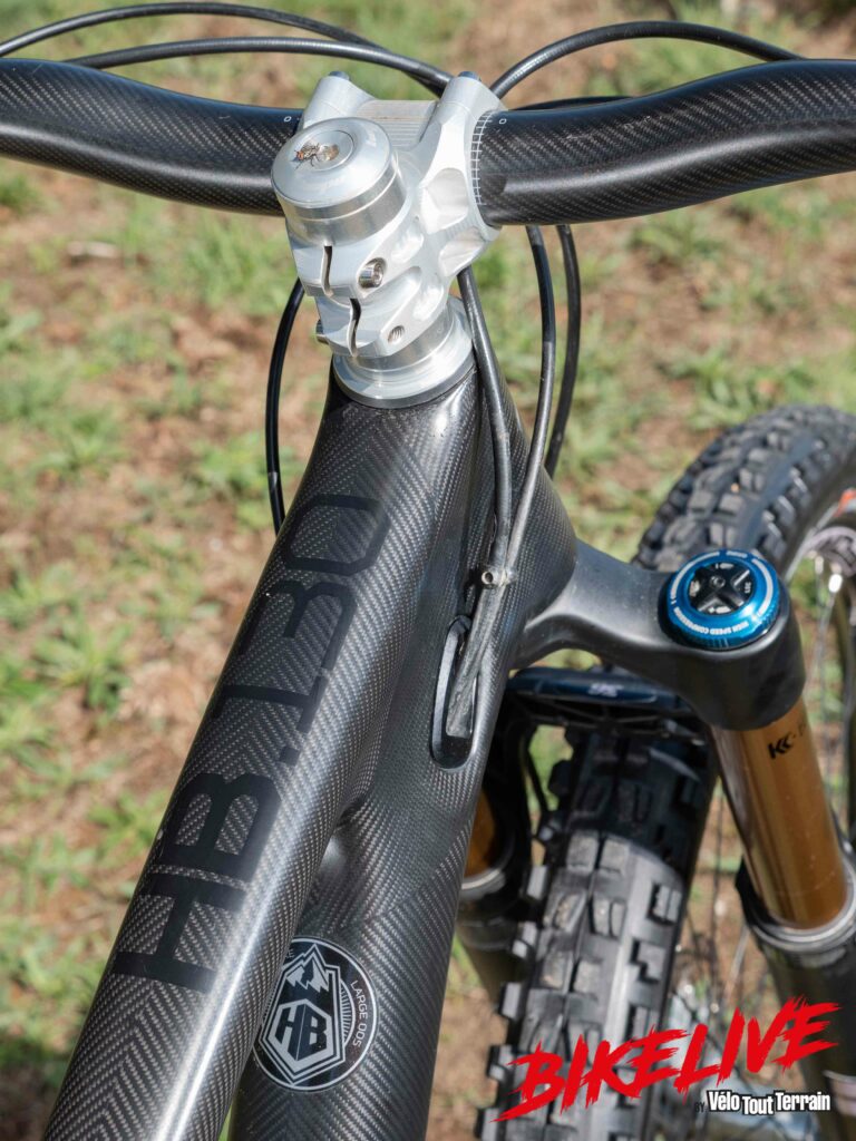 GEOMETRIE 29 : Taille : L – Tube supérieur : 627 mm – Tube de selle : 450 mm – Angle de direction : 66,5°/ 66° – Angle de tube de selle : 76,2°/75,7° – Bases : 435 mm – Empattement total : 1213 mm – Hauteur de boîtier : 338-331 mm – Reach : 475 mm – Stack : 622 mm (position haute), 626 mm (position basse) – GEOMETRIE Mulet ( fourche 150 mm) Taille : L -Tube supérieur : 627 mm – Tube de selle : 450 mm – Angle de direction : 65.6° – Angle de tube de selle : 75.1° – Bases : 435 mm – Empattement total : 1216 mm – Hauteur de boîtier : 335 mm – Reach : 465 mm – Stack : 627 mm – FICHE TECHNIQUE : Tailles : M, L, XL – Modèle d’essai : L – Cadre : carbone / Alu HB.130 – Fourche : FOX 36 Factor, déport 44 mm – Amortisseur : Fox DPX2 Factory – Freins : Hope Tech3 E4, ø180 mm – Dérailleur arrière : Sram Eagle XO – Pédalier : Sram Eagle XO, 170 mm ,32 dts – Commande : Sram Eagle XO – Cassette : Sram Eagle XO, 10-52 dents – Roues : av. Hope Pro4 boost/jante Fortus 26 ; ar. Hope HB Pro4 130-17mm ou Boost 148 mm/jante Fortus 26 – Pneus : av. Maxxis Minion DHF Exo 3C Maxx Terra, 29×2.5WT ; ar. Minion DHR Exo 3C Maxx Terra Exo, 29×2.3 – Potence : Hope AM 35, 31,8 mm – Cintre : Hope Carbon, 780 mm – Tige de selle : Fox Transfert Factory, 150 mm, ø31,6 mm – Selle : SDG Radar Logo HB.