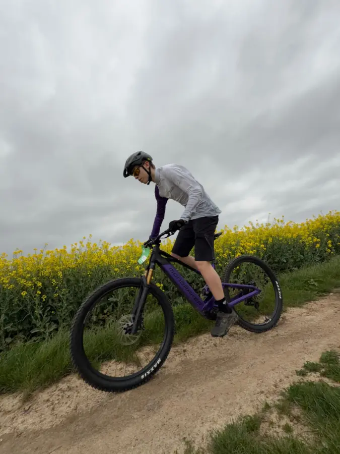 Véritable « couteau Suisse », le Mondraker Scree, ici en version RR , est un gros modèle de trail offrant 150mm de débattement avant et 130mm derrière : une combinaison généreuse pour notre terrain de jeu du week-end. Il est équipé d’un moteur Bosch CX Gen5 qui délivre 100Nm de couple qui étaient bien suffisants pour venir à bout des montées (courtes mais généreuses!) de la vallée. L’avantage du Scree, c’est qu’il offre un centre de gravité placé très bas, ce qui a permis, lors des quelques passages un poil plus techniques, de naviguer avec dextérité tout en donnant un certain confort : débattement généreux et géométrie étaient la bonne combinaison gagnante. Notre Scree était équipé d’une batterie de 800Wh, bien suffisante pour piocher dedans sans vergogne sur nos boucles , mais nous aurions pu nous contenter de la 600Wh, également proposée. Facile à prendre en main, plutôt ludique et vraiment agile, le Scree, c’est la porte d’entrée en VTT-AE, version Mondraker : un vélo qui donne vite des sensations!