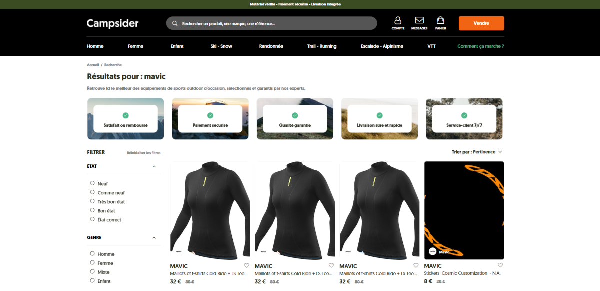 Campsider, c’est une plateforme de matériel d’occasion ou de seconde main comme on dit maintenant, lancée en 2021; dédiée aux équipements de sports, dont le vélo bien sûr et Mavic vient de s’associer à Campsider afin de proposer des produits de fin de série.