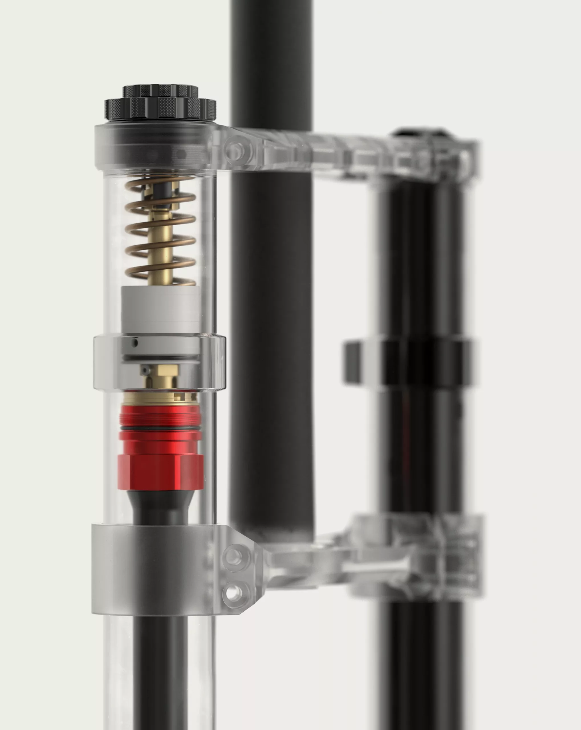 L’amortisseur Vivid Coil de son côté, reçoit la cartouche RCT2 qui permet de régler indépendamment, sans interférences, la compression basse vitesse (LSC) et la compression haute vitesse (HSC), un réglage numéroté de la compression, pour un ajustement intuitif : il suffit de partir de « 0 » et d’ajouter ou d’enlever de l’amortissement, une valve de base réduisant de 40 % les forces au niveau de l’IFP, pour plus de souplesse tout en préservant une accroche optimale, les réglages de compression du piston principal sont adaptés à la performance de la cartouche Charger 3.2, pour favoriser le soutien en milieu de course, le talonnage réglable (ABO) dispose d’une molette pratique avec cinq réglages de compression pour personnaliser l’amortissement dans les derniers 20 % de la course et cette molette de détente amovible sert aussi pour régler la HSC (compression haute vitesse). On retrouve les 20 clics de réglage avec leurs courbes de détente uniformes et il est livré avec un adaptateur à roulements 8×30 pour les œillets standards. Réglages de détente R25 etR55 / compression : C22, C26, C30, C34, C37, C40 etC43/ force de blocage X05, X25 et X45