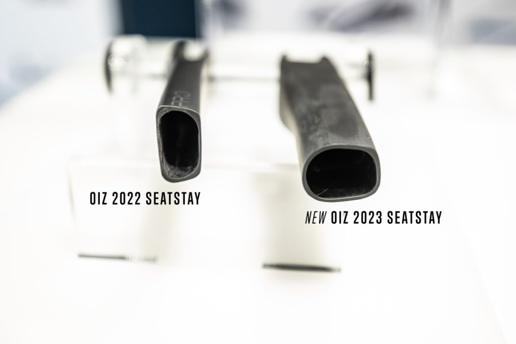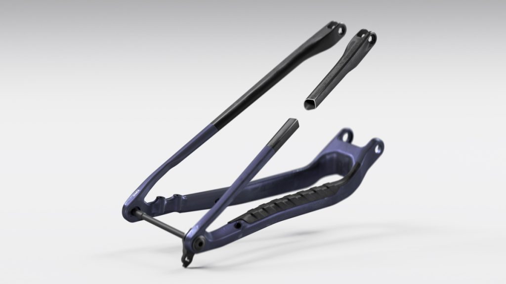 l’Oiz conserve aussi son système monopivot caractéristique avec plus de souplesse dans les haubans (UFO), présent depuis plus de 20 ans dans les gammes Orbea. . Enfin, on retrouve aussi le verrouillage de suspension Orbea à trois positions (Squidlock) pour optimiser la performance. Le cadre est annoncé à 1750gr pour un modèle complet à 9.8 kg en taille M, tout ceci grâce à l’utilisation des technologies comme l’UFO, mais aussi via la nouvelle biellette en carbone et un nouveau processus de laminage des cadres en carbone OMX : le laminage du cadre a donc été revu en prenant en compte la nouvelle géométrie, ainsi que le transfert de chaque watt de puissance. Une attention particulière a également été apportée à la conception du triangle arrière. La forme des haubans a été redéfinie pour augmenter la superficie des tubes, ce qui a permis d’accroitre de 12 % la rigidité en comparaison avec le cadre actuel. Les roulements sont aussi totalement nouveaux et ont été choisis pour leur rigidité.; et tous les cadres sont garantis à vie.