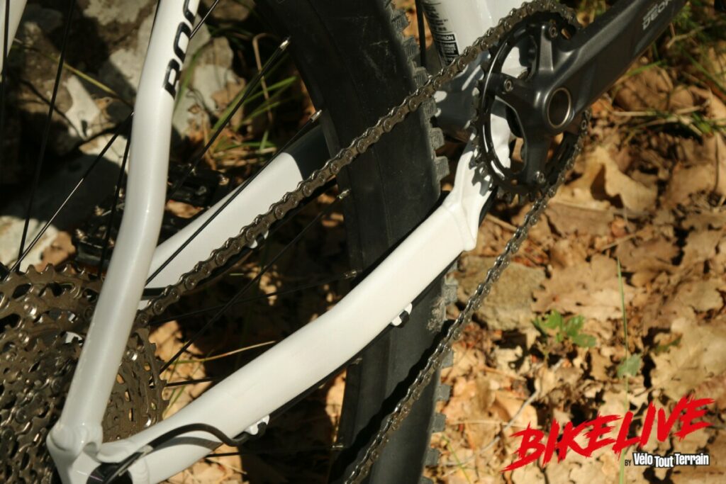 Bien vues les bases asymétriques : aucun contact avec la chaîne et elles autorisent la monte de pneus de grosse section. DR. C. Vérité