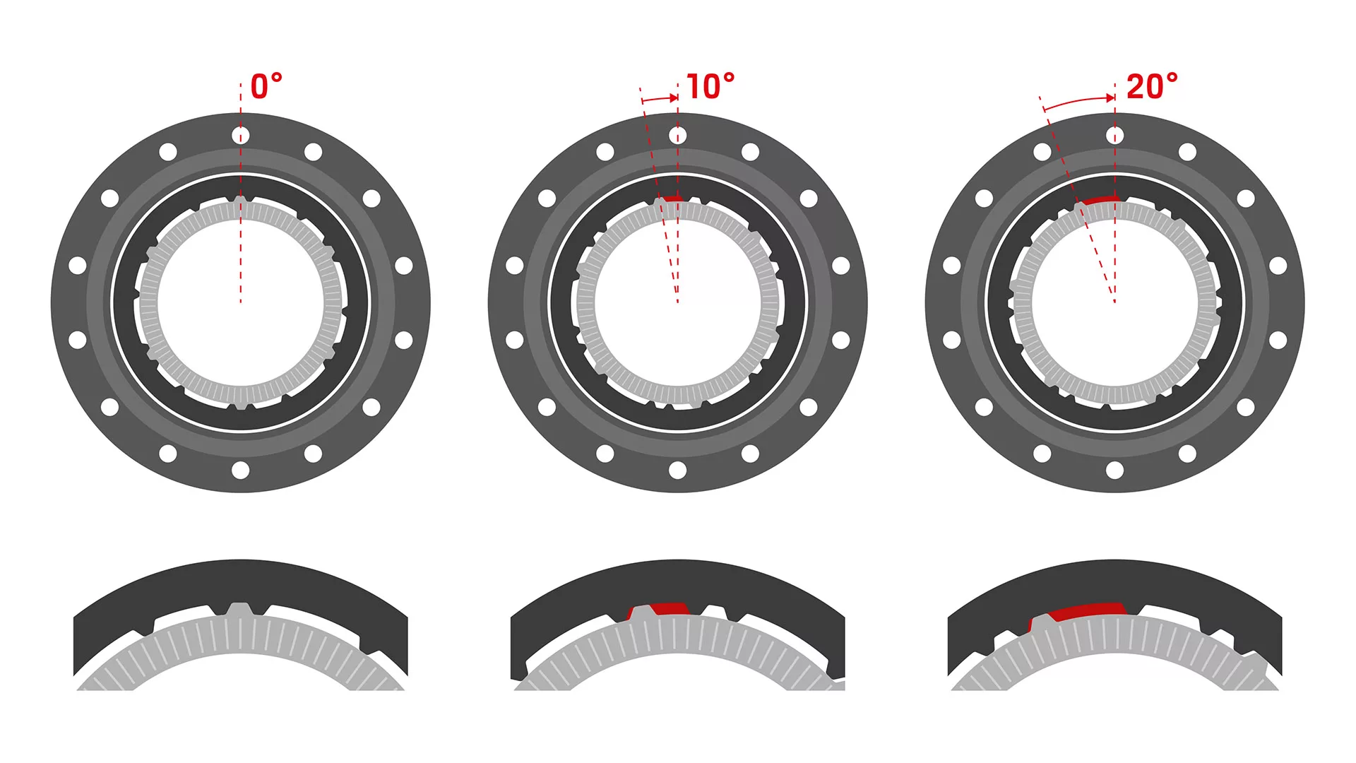 En réglage 0°, le moyeu fonctionne comme un moyeu standard à engagement rapide, avec 90 dents et 4° d’angle d’engagement. Idéal pour les pratiquants XC ou tous ceux qui privilégient un engagement instantané et une transmission de puissance immédiate plutôt qu’une suspension ultra fluide en descente. Ce réglage conviendra particulièrement aux roues 28|XC et 30|SL.