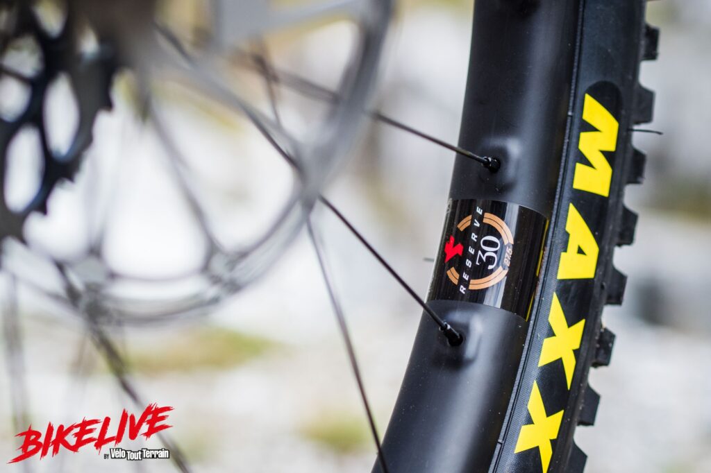 GEOMETRIE : Taille : L – Tube supérieur : 610 mm – Tube de selle : 430 mm – Angle de direction : 64°-63,7° – Angle de tube de selle : 77,9°-77,5° – Bases : 435-436 mm – Empattement total : 1256-1257 mm – Hauteur de boîtier : 344-340 mm – Reach : 475-472 mm – Stack : 623-626 mm – FICHE TECHNIQUE : Tailles : S,M, L, XL – Modèle d’essai : L – Cadre : cadre carbone CC – Fourche : Fox 38 Factory, déport 37 mm – Amortisseur : Fox X2 ou option DHX2 Factory – Freins : Sram Code RSC, ø200 mm – Dérailleur arrière : Sram Eagle XO1 – Pédalier : Sram Eagle X01, 32 dts + protection One Up – Commande : Sram Eagle XO – Cassette : Sram XG1295 10-52 – Roues : jantes Reserve 30, moyeux DT Swiss350, rayons Sapim – Pneus : av. Maxxis Assega Exo+ , 27.5 x 2.50 » ; ar. Maxxis Minion DHR Exo+ 27.5×2.50 » – Potence : Burgtec Enduro MK3, 45,5 mm – Cintre : Santacruz 35 , 800 mm – Tige de selle : RockShox Reverb Stealth, 170mm, ø31,6 mm – Selle : WTB Sliverado Team.