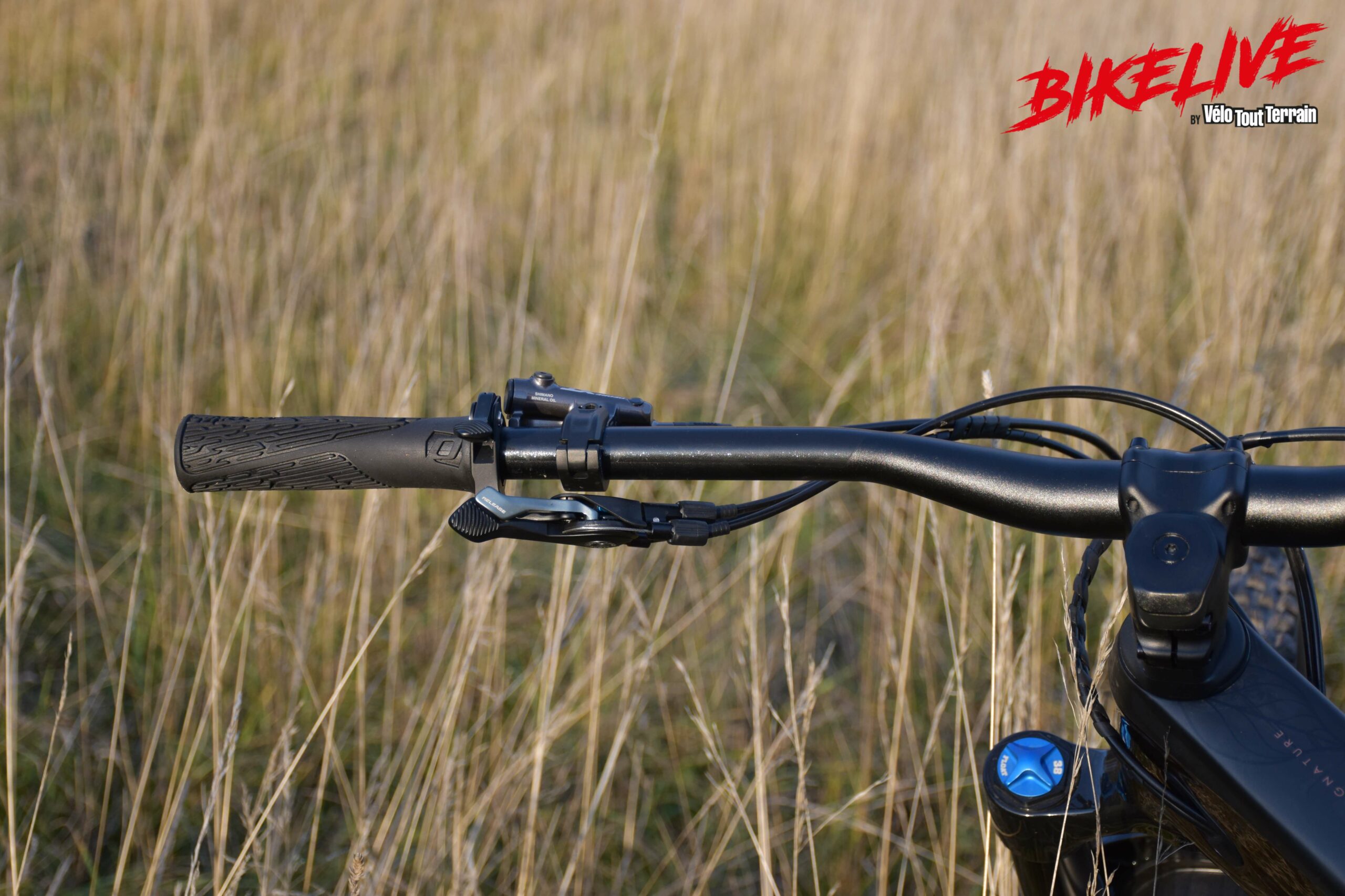 Le Ransom est donc un gros vélo. Trop peut-être ? Car quelque chose me chagrine, et c’est loin d’être un détail. Du haut de mon mètre 64, j’ai testé ce vélo en taille S. Je pèse 51 kg. Eh bien… d’abord la Fox 38 est bien trop grosse pour moi. Je suis allée jusqu’à mettre moins de 45 psi et à rouler sur du défoncé technique, ma fourche ne s’est jamais enfoncée de plus 30%, le maximum atteint. En plus de ne pas exploiter cette formidable fourche, je la trouve trop lourde pour mes petits bras. Enfin quand je dis trop lourde, c’est un tout, l’avant est lourd aussi du fait des roues de 29 pouces, de ses gros pneus. Un saut ? Je n’arrive pas à lever la roue. C’est dommage quand on a envie de jouer avec son vélo… Une Fox 36 aurait été plus adéquate et adaptée. A moins d’aller chez son vélociste et faire retirer des tokens. Ensuite, il y a ces pneus à la section dantesque : le 2.6, c’est bien sur un e-bike, mais là… il est impossible à emmener dans les montées, d’autant qu’avec l’inertie du 29”, il faut du gros mollet. Si c’était mon vélo, je lui collerais directement du 2.4, au maximum, qui est déjà vraiment gros, pour rendre le Ransom plus roulant. Et puis il y a ce cintre de 80 cm, vraiment trop long, qui m’a fait taper les phalanges à plusieurs reprises sue des branchages. Au niveau de l’ergonomie du poste de pilotage, à la main gauche on a un blocage de fourche et amortisseur (le TwinLoc, spécifique à Scott), qui à mon sens est inutile : on ne roule pas sur la route avec un Ransom, hein ? Juste au-dessus se trouve la commande de tige de selle et j’ai eu tendance à souvent confondre les deux dans le feu de l’action. L’articulation du pouce avait aussi trop tendance à frotter la commande de blocage.
