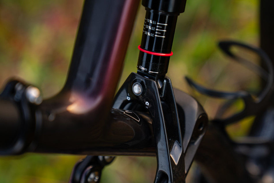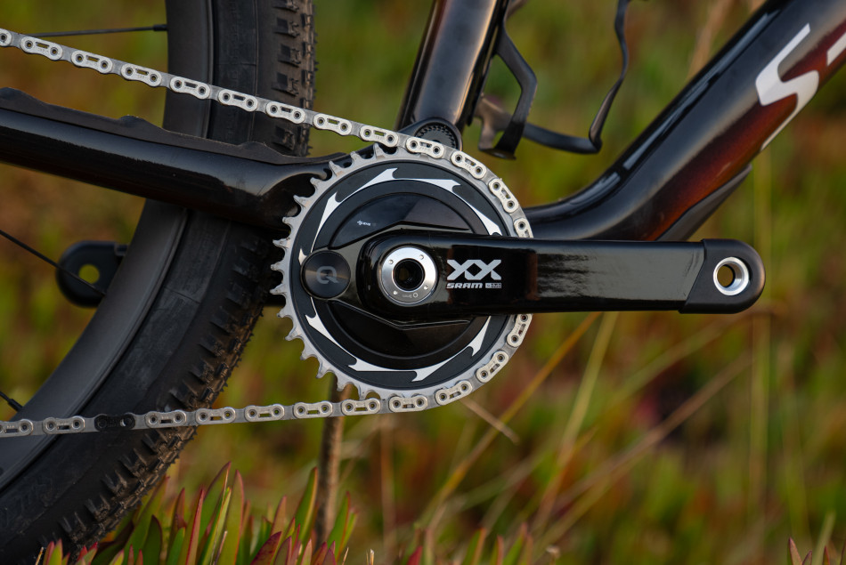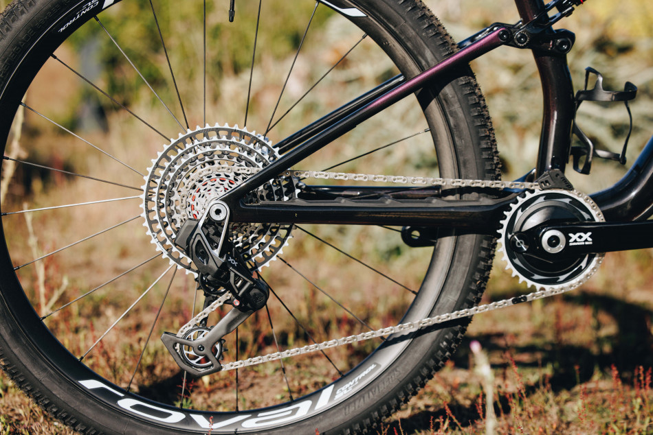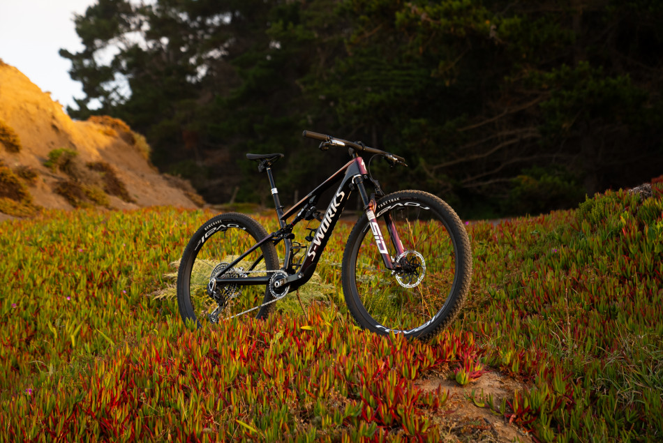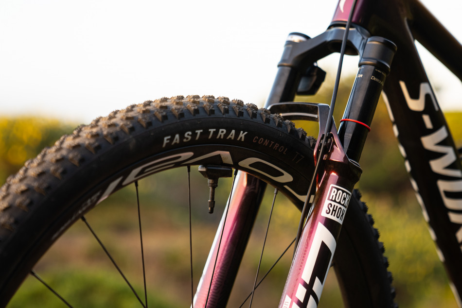 Epic 8 EVO : fourche Fox 34 130 mm, amortisseur Fox Float 2 positions, freins SRAM Code 4 pistons, pneus Specialized Purgatory 2.4 av. et Ground Control 2.35 ar.