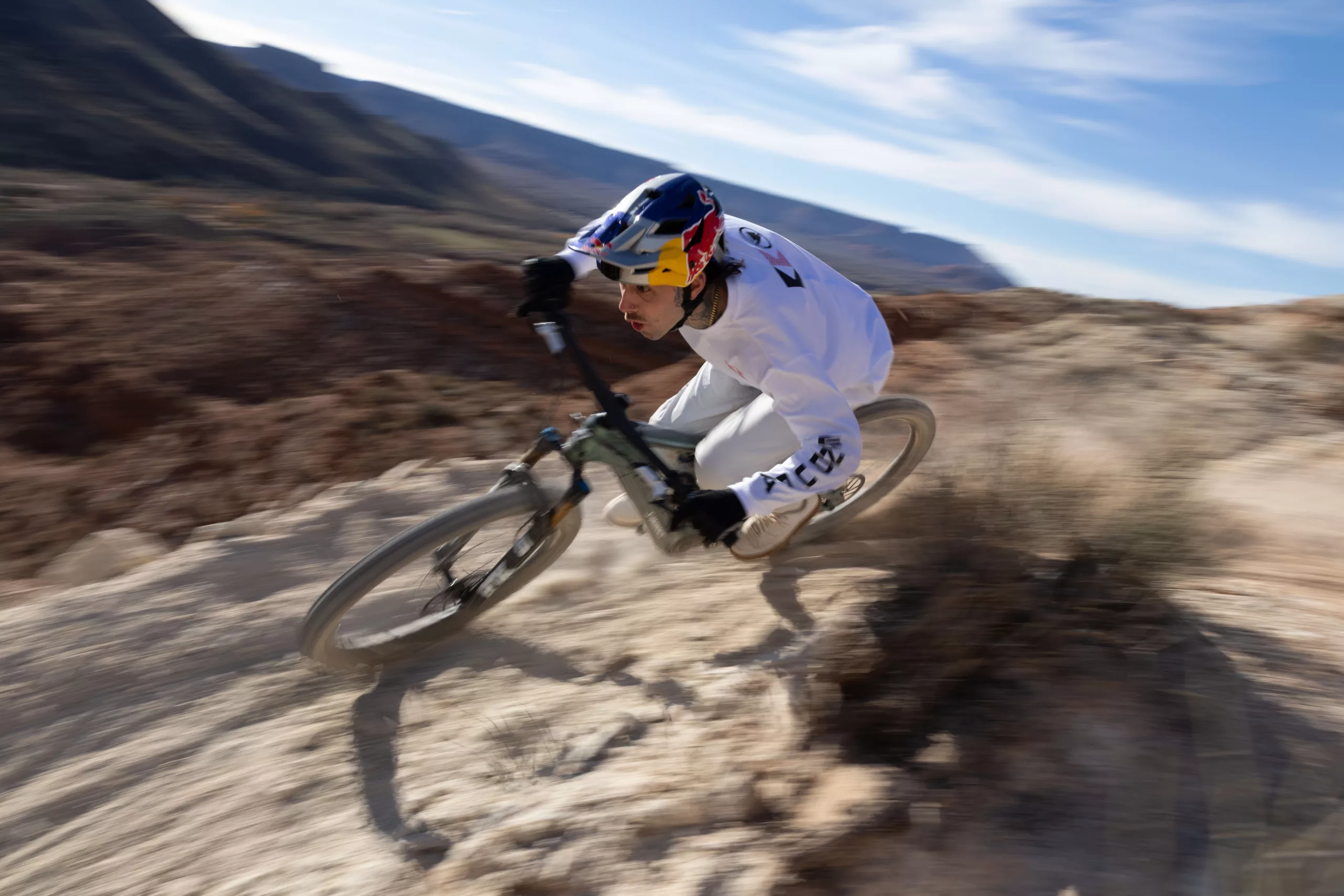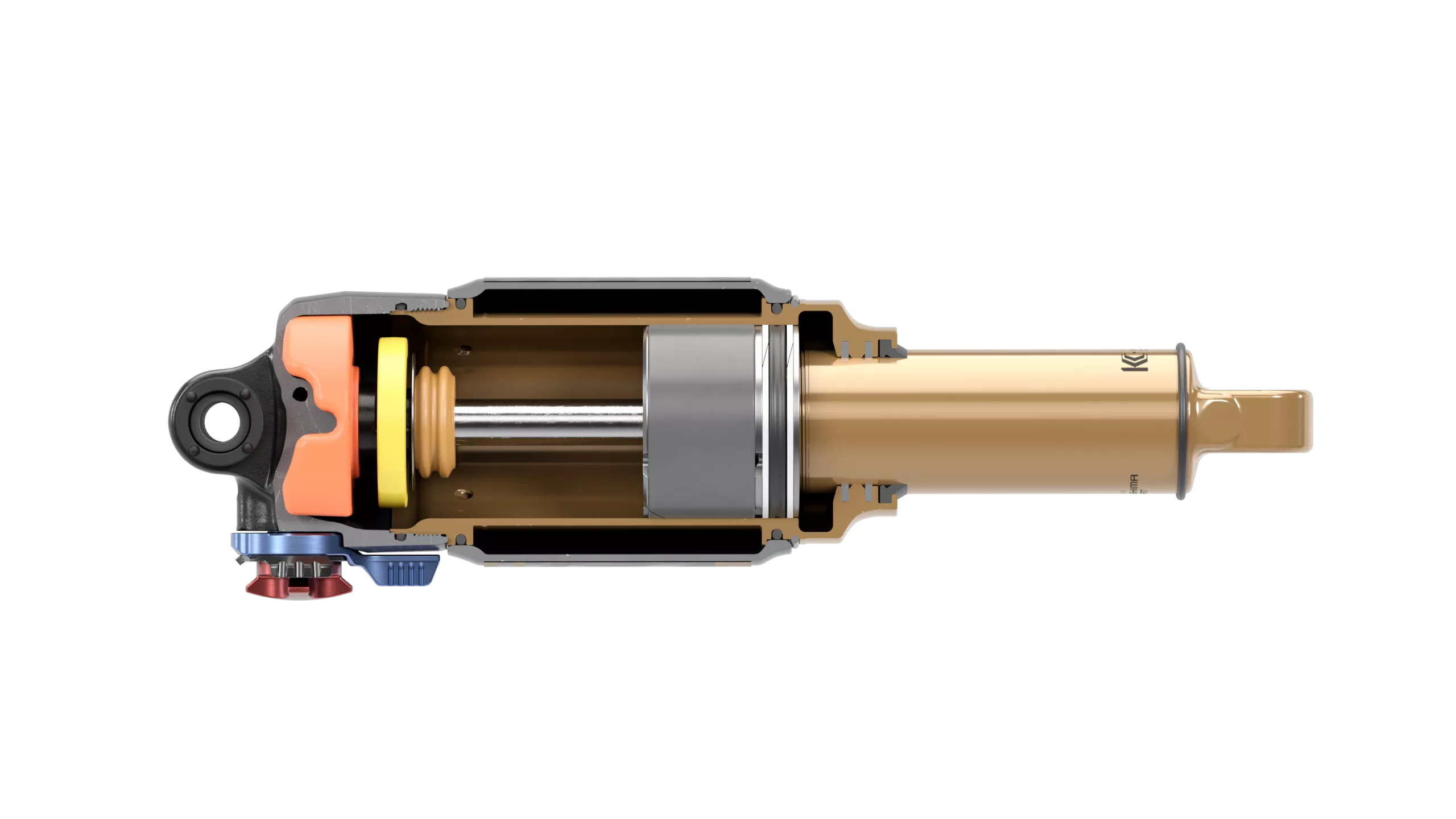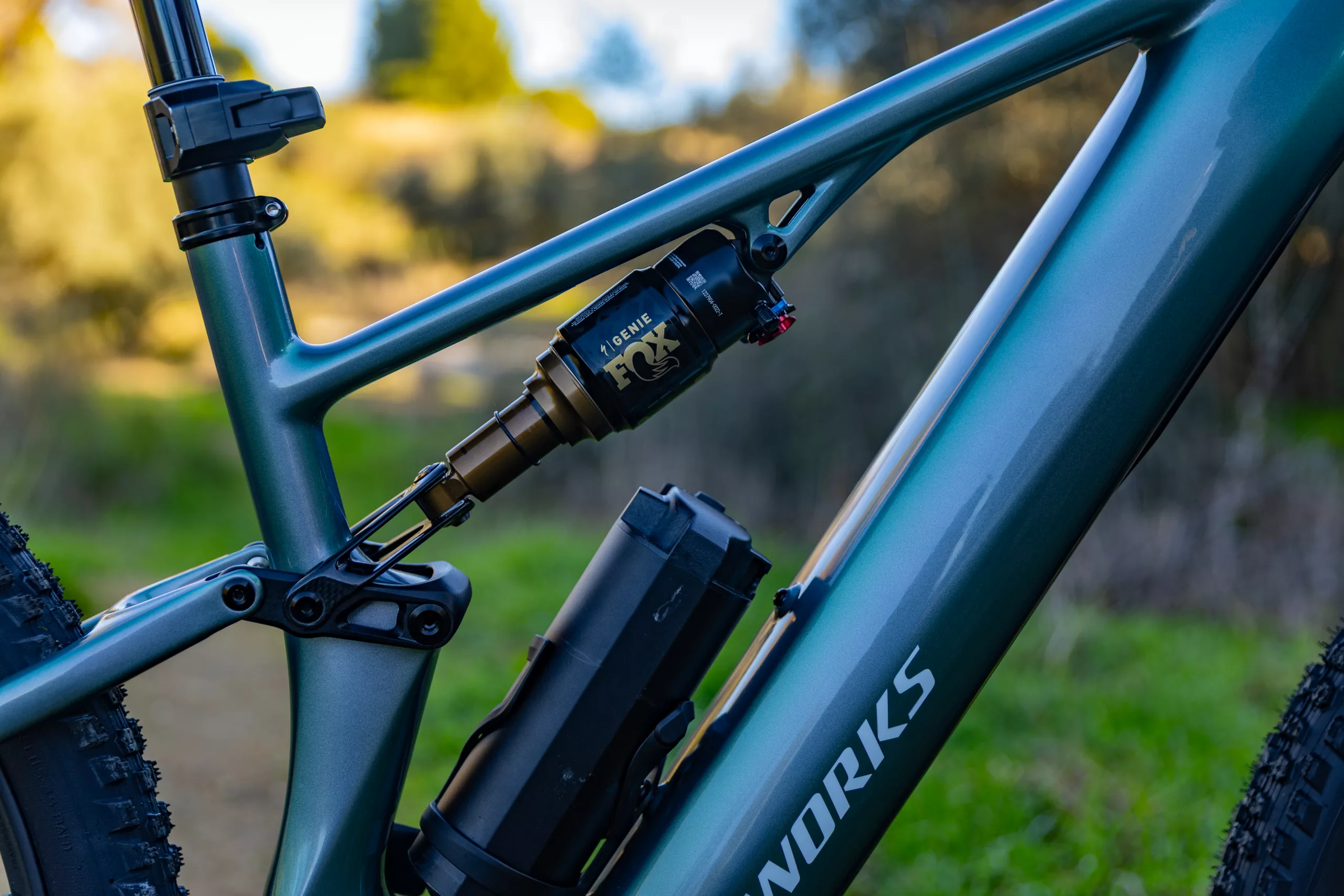 La suspension, dont le cœur est le système GENIE, en instance de brevet, dispose ici d’un réglage spécifique type « Rallye ». Le FOX FLOAT GENIE offre une courbe de ressort plate, semblable à celle d’un ressort hélicoïdal, sur les 70 premiers pour cent de la course, suivie d’une