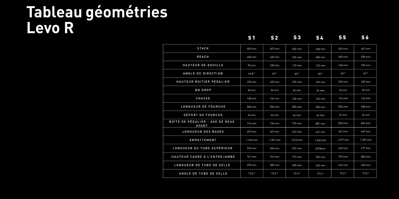 Le cadre est en carbone FACT et dans conception, il partage avec le Levo 4 le compartiment de batterie Wattage Cottage et le rangement SWAT dans le tube oblique, mais avec un cadre affichant 530gr de moins et des roues en 29 pouces, ainsi que sa géométrie « rallye » : elle favorise une position basse et efficace qui favorise la vitesse en montée et l’agilité en descente. Le Levo R abaisse le centre de gravité et positionne le pilote vers l’avant pour plus d’équilibre et de contrôle. La géométrie réglable comprend un tube de direction à trois positions (neutre, et +/-1°), un boîtier de pédalier à deux positions (haute et basse soit +/-5mm) et des Flip Chips sur les bases (courtes -6mm ou longues), permettant aux pilotes d’ajuster précisément le vélo au terrain et à leur style.