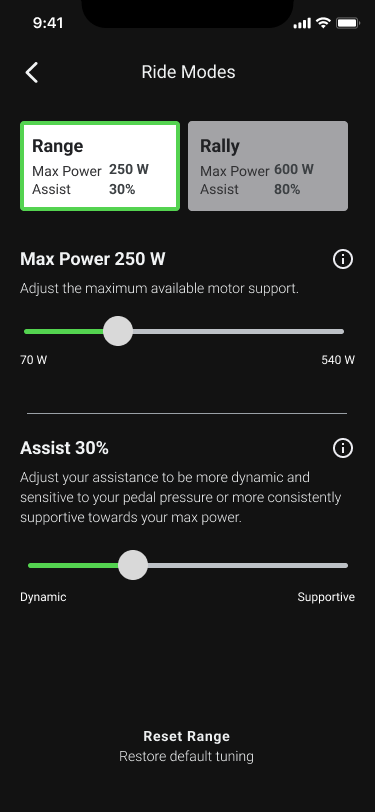 * 2 modes : range (couple et assistance moindre pour plus d’autonomie / rally (plus de puissance)